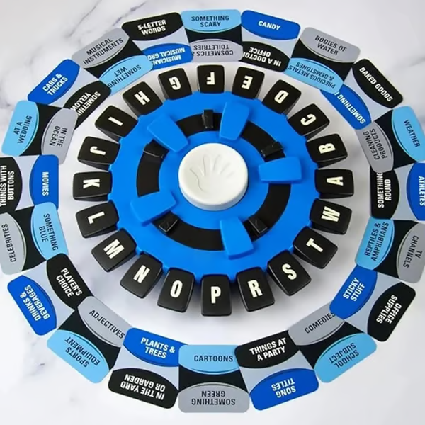 If you draw a "Pizza Toppings" card, players will use the letters on the spinner (A, B, C, D, etc.) to name a related word that starts with the chosen letter. For example, if the letter is "M," you can say "Mozzarella" within 10 secondsAfter saying your answer, tap the timer for the next player's turn.